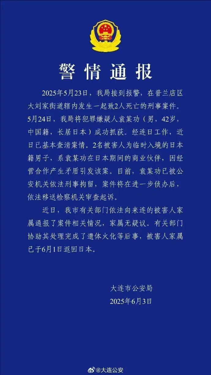 通報說,5月23日,警方接獲報警,指普蘭店區大劉家街道發生一起致兩人死亡的刑事案件。 24日,警方迅速抓獲了犯罪嫌疑人袁某功(男、42歲,中國籍,長期居住在日本)。受害者是兩名臨時入境的日本籍男子,他們與袁某功在日本的商業活動中是合作夥伴。警方初步調查顯示,案件起因是經營合作的矛盾,具體案情仍在進一步偵辦中。