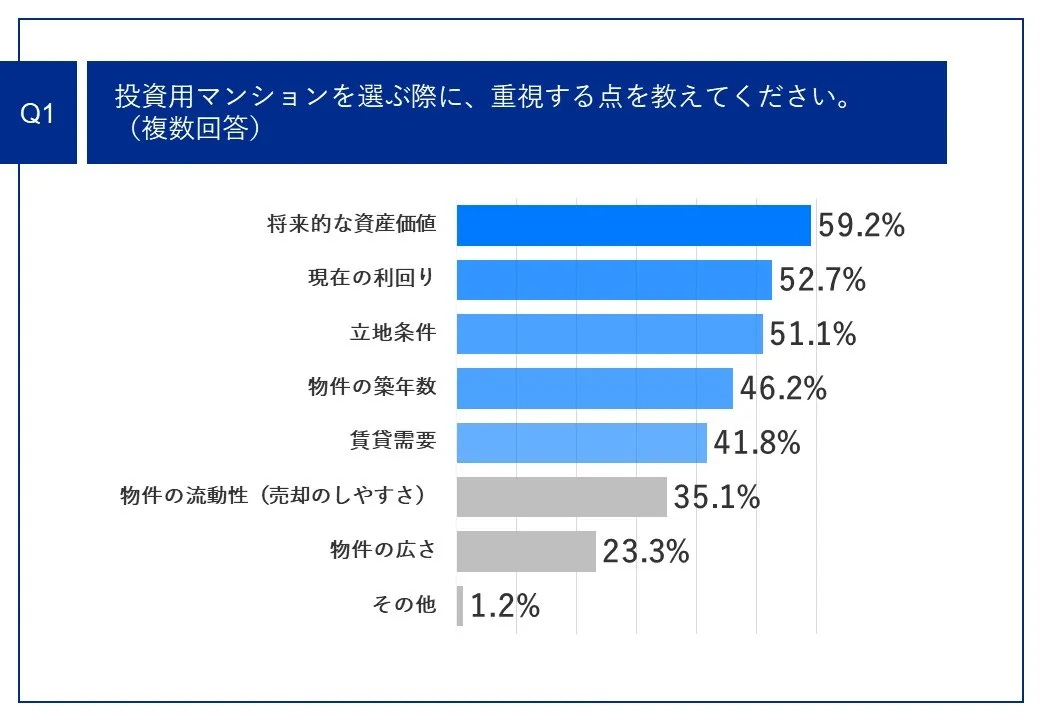 「Q1. 請問在選擇投資用公寓時,您會重視哪些方面?(可多選)」(共507人回答),結果顯示「未來的資產價值」佔59.2%,「當前的收益率」佔52.7 %,「地理位置」佔51.1%。