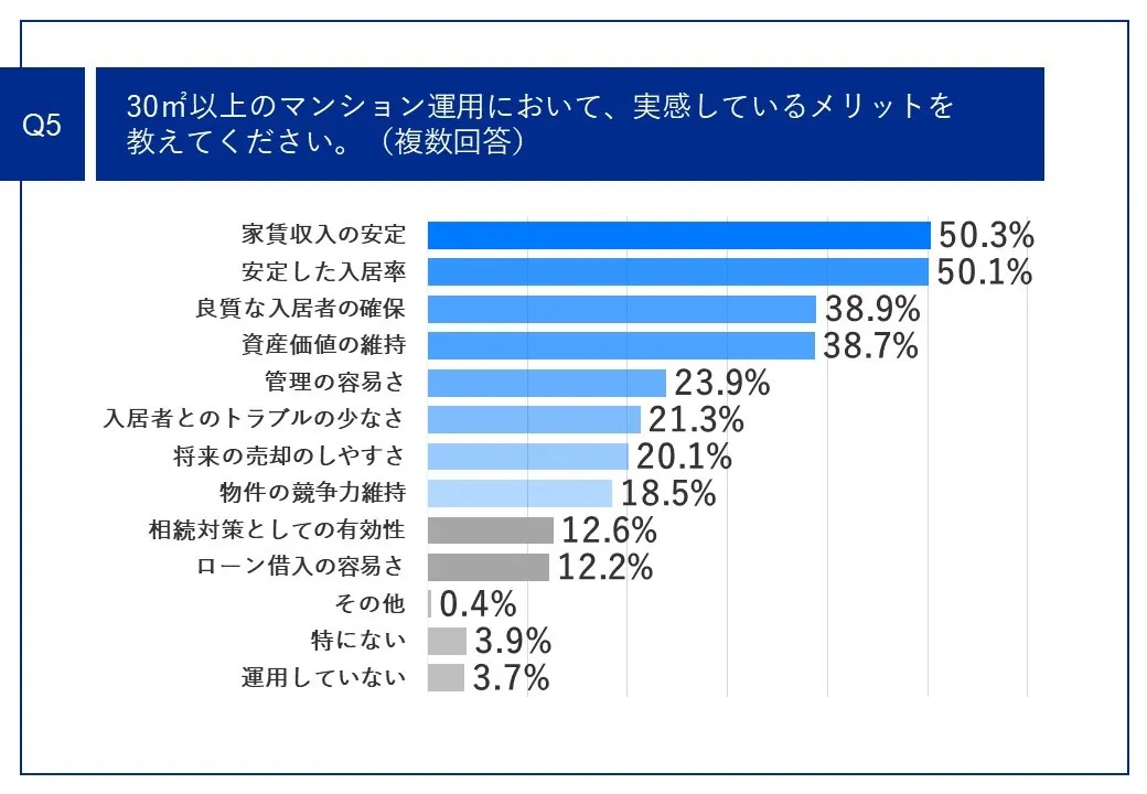 在超過30平方公尺的公寓營運中,我們詢問了507人他們實際感受到的好處是什麼。結果顯示,「租金收入穩定」佔50.3%,「穩定的入住率」佔50.1%,「保證優質租戶」的比例為38.9%。