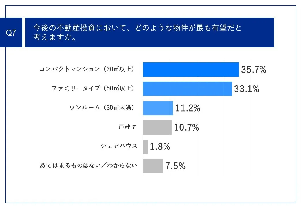 此外,作為未來有希望的房地產投資對象,「小型公寓(30平方公尺以上)」以35.7%的比例被選中最多,超過了「家庭型公寓(50平方公尺以上)」(33.1%)。