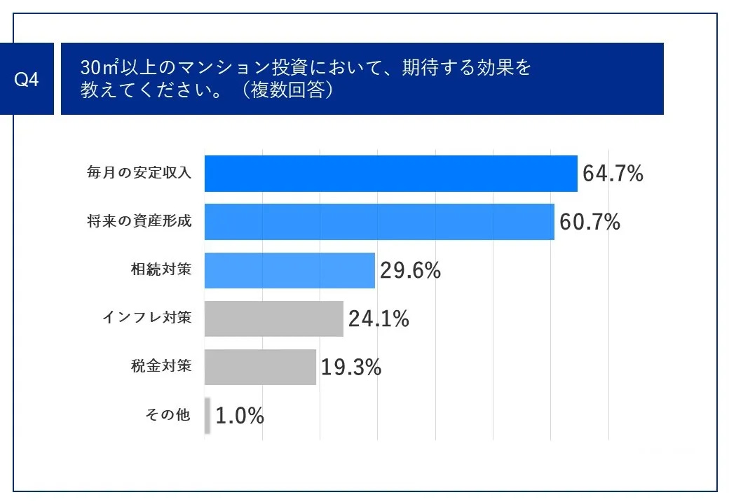 在對面積超過30平方公尺的公寓投資進行調查時,問及期望效果(多選),結果顯示「每月穩定收入」佔64.7%,「未來資產形成」佔60.7%,「遺產規劃」佔29.6 %。