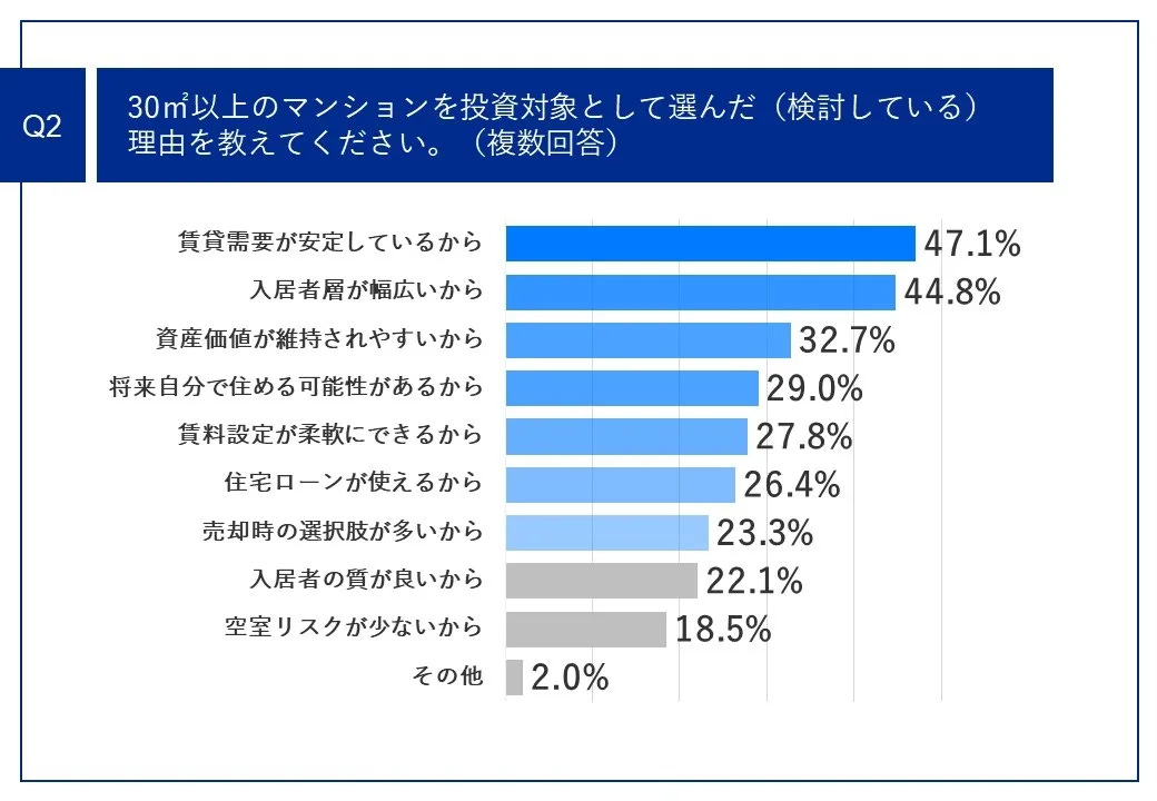 除了Q2的答案外,如果您選擇(或正在考慮選擇)30平方米以上的公寓作為投資對象,請具體告訴我們原因。其中包括「因為這樣的大小容易找到租客」和「期待將來能升值」等。