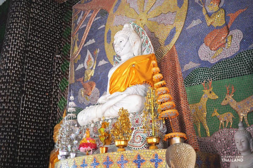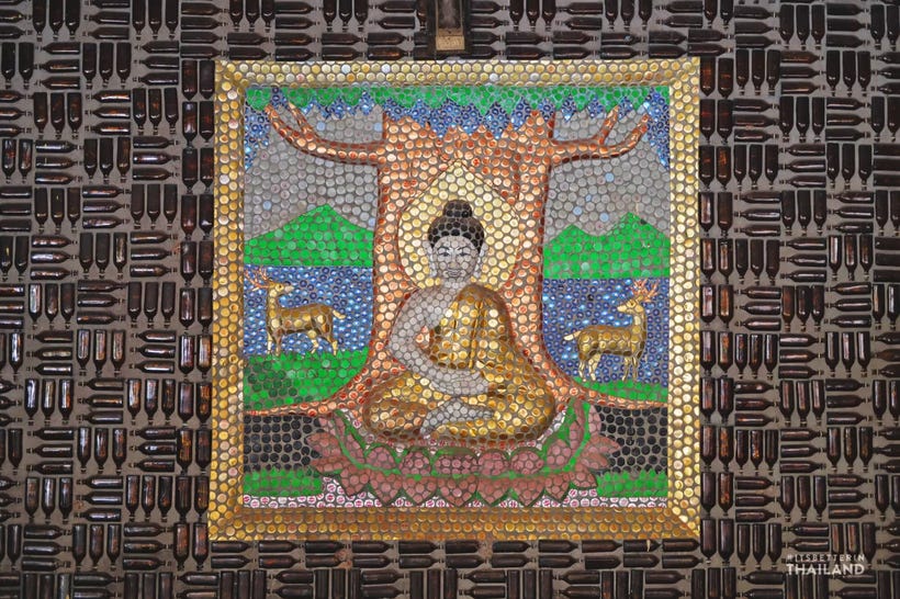 是的,為了充分回收利用廢棄酒瓶,寺內的大部分壁畫,以及佛像坐台,幾乎都是通過瓶蓋來設計加工而成。