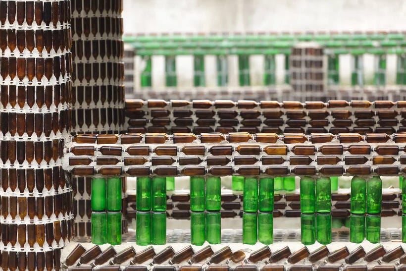 廊柱主體由棕色瓶子與混凝土組成,如果你仔細觀察細節,會發現橫欄的瓶子線條,形成了正反交錯的設計,毫不草率。除了立柱和連廊,整個地面也是由一個個瓶子鋪設而成,如同馬賽克地板一樣,在陽光下交相輝映。