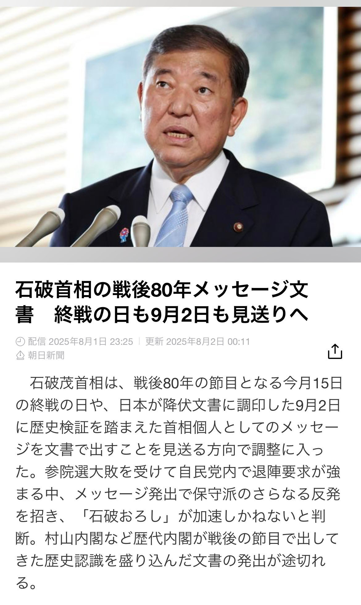 日本投資 —— 日本當今最為擔心的一件事Kenji SanAug 03, 2025∙ Paid1Share日本剛剛結束參議院大選,石破茂領導的自民黨宣告慘敗,作為黨總裁的石破茂拒絕引咎辭職,觸發了自民黨內“打倒石破茂”的浪潮。其實,當今的日本政界擔心的不只是石破茂會不會辭職,而是擔心石破茂會不會在過幾天發表一份《終戰80週年談話》。為什麼?因為日本的保守派非常擔心,石破茂會沿用“村山談話”的精神,重提“侵略”,並以此否定安倍晉三前首相的“70週年談話”核心。Continue reading this post for free, courtesy of Kenji San.Claim my free postOr purchase a paid subscription.