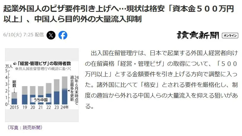 目前申請人註冊公司的註冊資本金起點僅需500萬日元,而韓國同類簽證需要約3000萬日元,相差5倍!法務省明確表示,這樣的低門檻導致大量申請人將經營管理簽證視為移民跳板,而不是真正抱著創業的想法來日本。