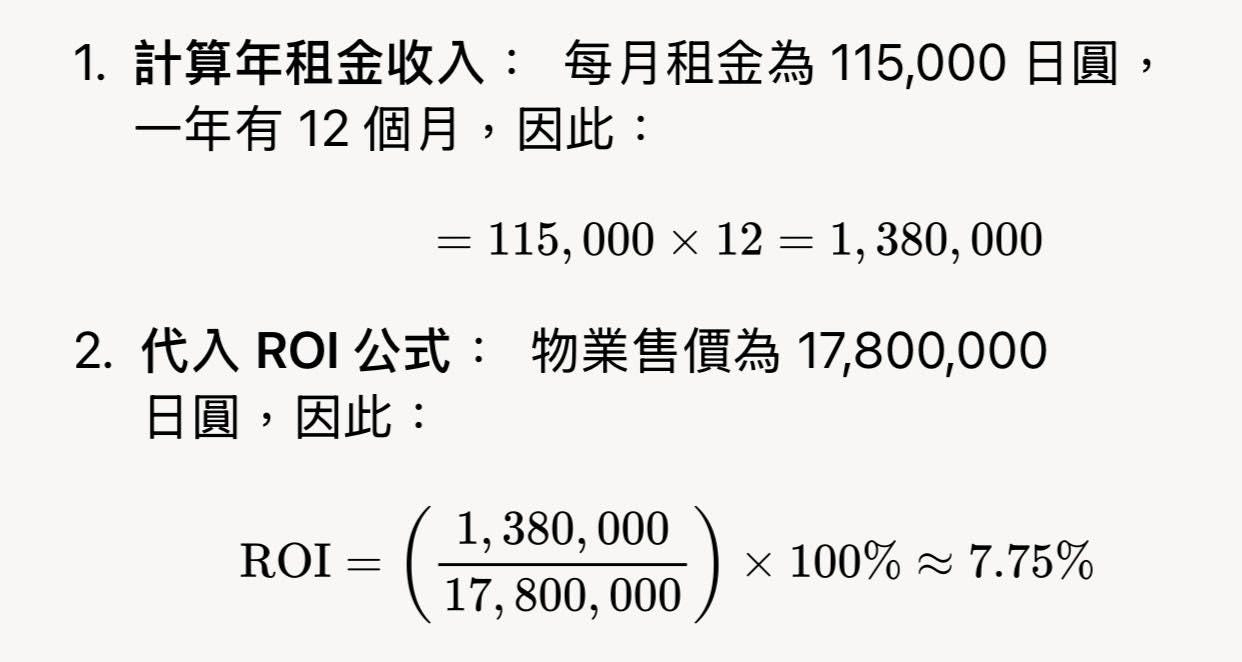 要計算物業的投資回報率(ROI),我們可以使用以下公式:ROI = (年租金收入 / 物業售價) × 100%