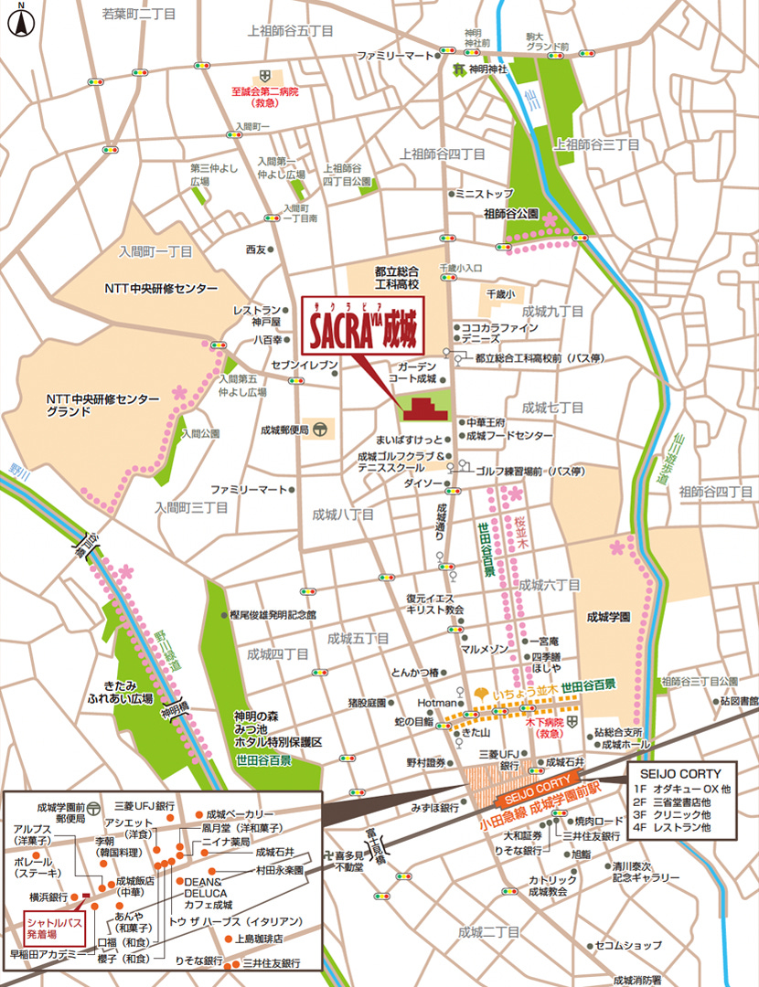 Sacravia Seijo 佔地約 3,000 坪(約 1,000 平方米),位於東京最高檔的住宅區 Seijo,入住條件包括 70 歲或以上,入住時不需要支援或照顧。