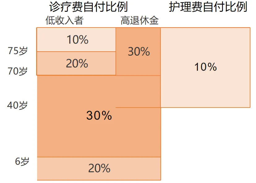 在日本繳納醫療保險後,日本政府會承擔70%的費用,個人只需負擔30%的費用。如果是70歲以上的老人則只需負擔20%,75歲以上甚至主要承擔10%的費用。一般來說,15歲及以下兒童免費。