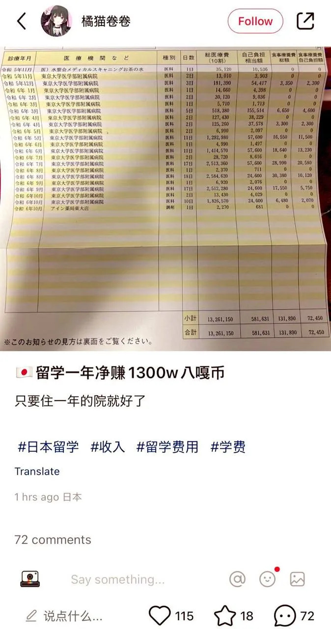 近日,在國內社交平台上,中國賤民留學生宋可欣稱,日本留學一年淨賺1300萬日元,只要住一年的院就好了。
