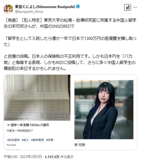 這名學生的貼文被翻譯成日文後,在日本社群網站上迅速傳播,閱讀量突破千萬,引起了許多日本網友的不滿。
