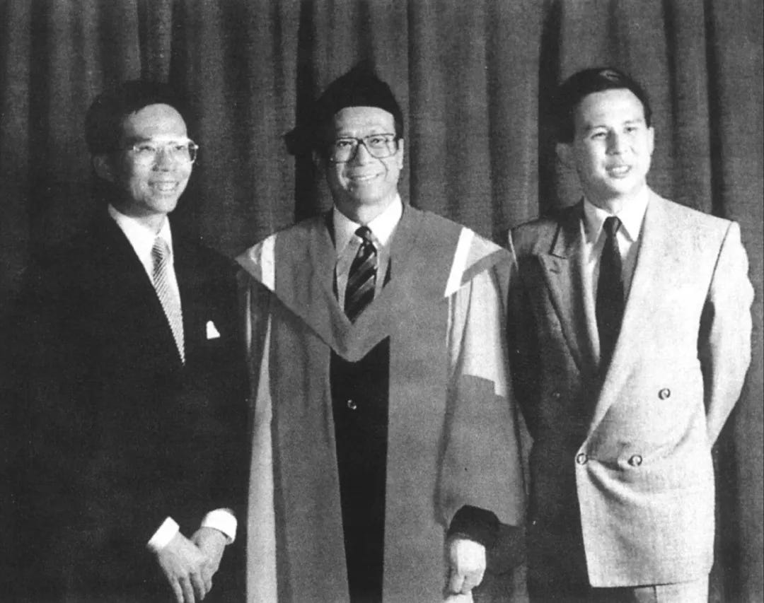 1989年,李嘉誠獲得加拿大加里大學榮譽法學博士學位,並與兩個兒子合影。