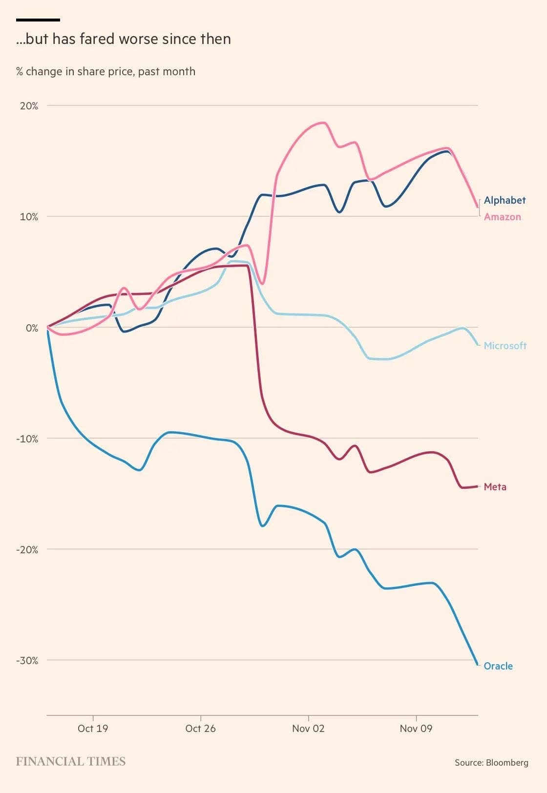 十月中以來,甲骨文股價已經下跌3成,進入熊市,這段時間它為了追趕 AI 浪潮、大舉借債投入晶片與數據中心建設,讓華爾街開始擔心,這場豪賭可能失控。