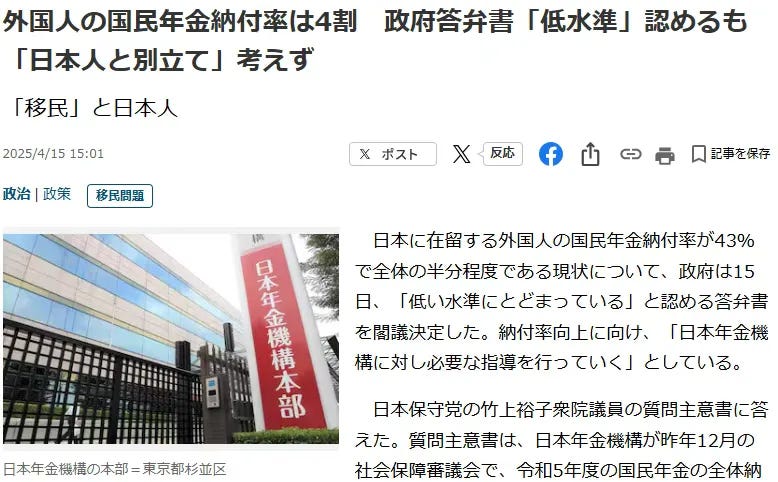 2024年12月,日本年金機構首次公佈了外籍群體專案統計,顯示2023年度外國人的國民年金繳納率斷崖式下跌,只有43.4%。