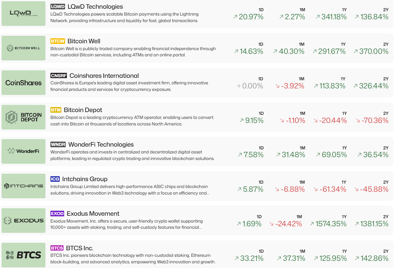 目前有超過20間美國上市公司重點關注並已購買加密貨幣以作為資產持有。此列表重點關注建立加密基礎設施和基礎技術的上市公司。