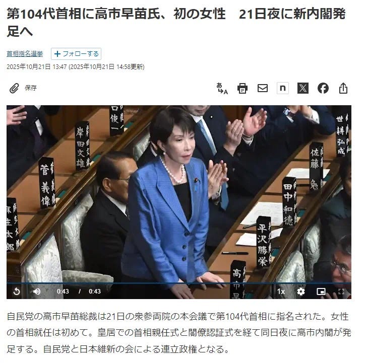 10月21日,64歲的高市早苗正式當選為日本第一位女首相,並立即宣佈組建新內閣。這位以強硬保守派形象著稱的政治家,帶著她的政治理念和執政決心,站在了日本的權力中心。她把自己的內閣定義為“決斷與前進的內閣”。