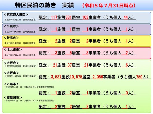 根據政府調查數據、正在實施《國家戰略特別區域法》經營著的民宿有:東京都大田區、千葉市、新潟市、北九州市、大阪府、大阪市、八尾市、寢屋川市。