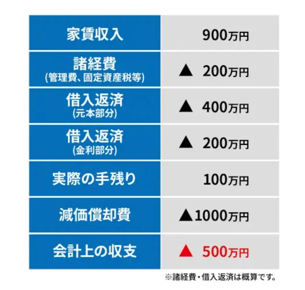 透過減價折舊,這位投資者不僅免除了租金收入的稅務負擔,還將多餘的500萬日圓虧損與薪資收入抵扣,實現整體稅務節約。