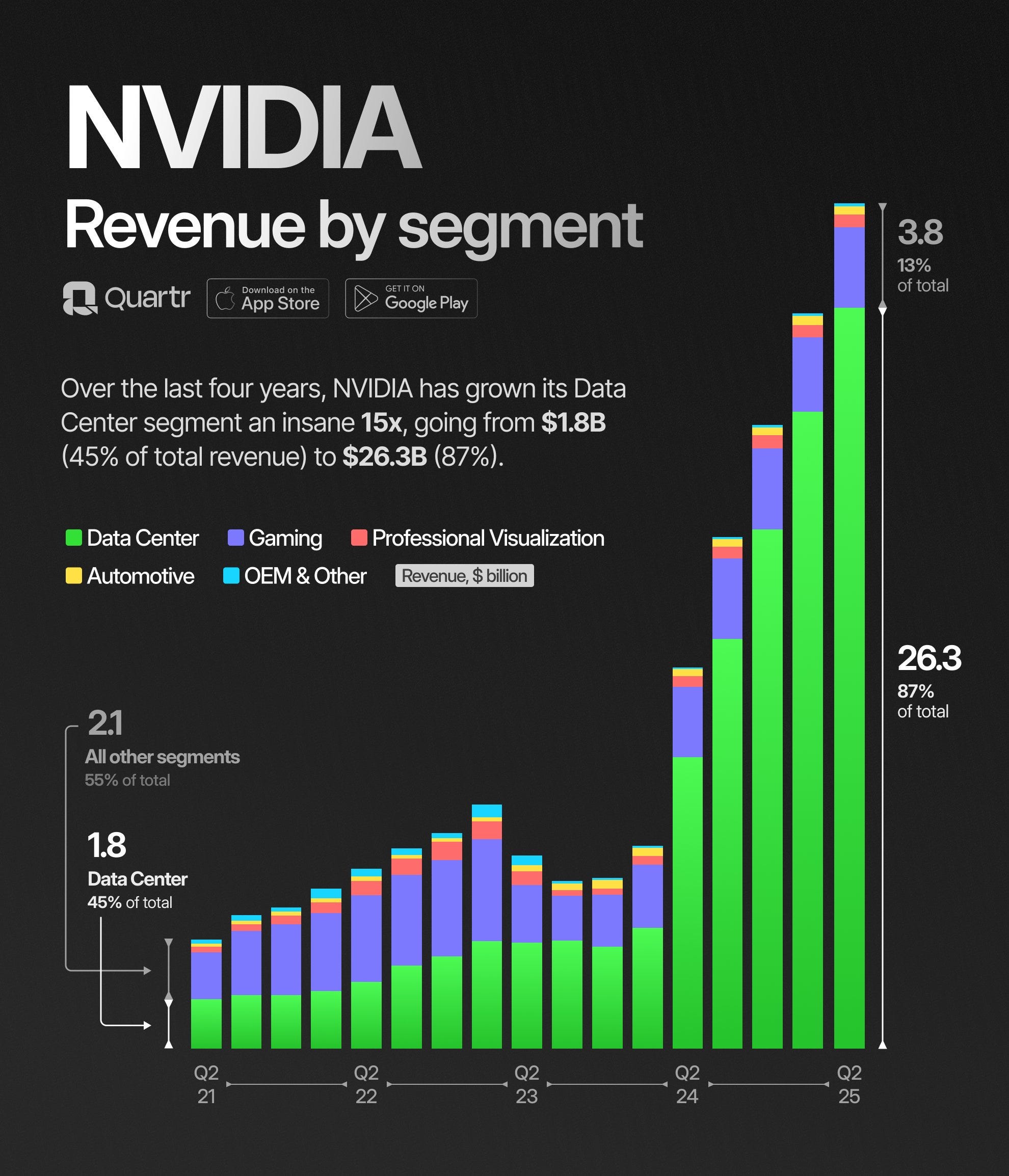 數據中心業務是主要亮點,該季度營收355.8億美元,年增93%,占總營收約90%。
