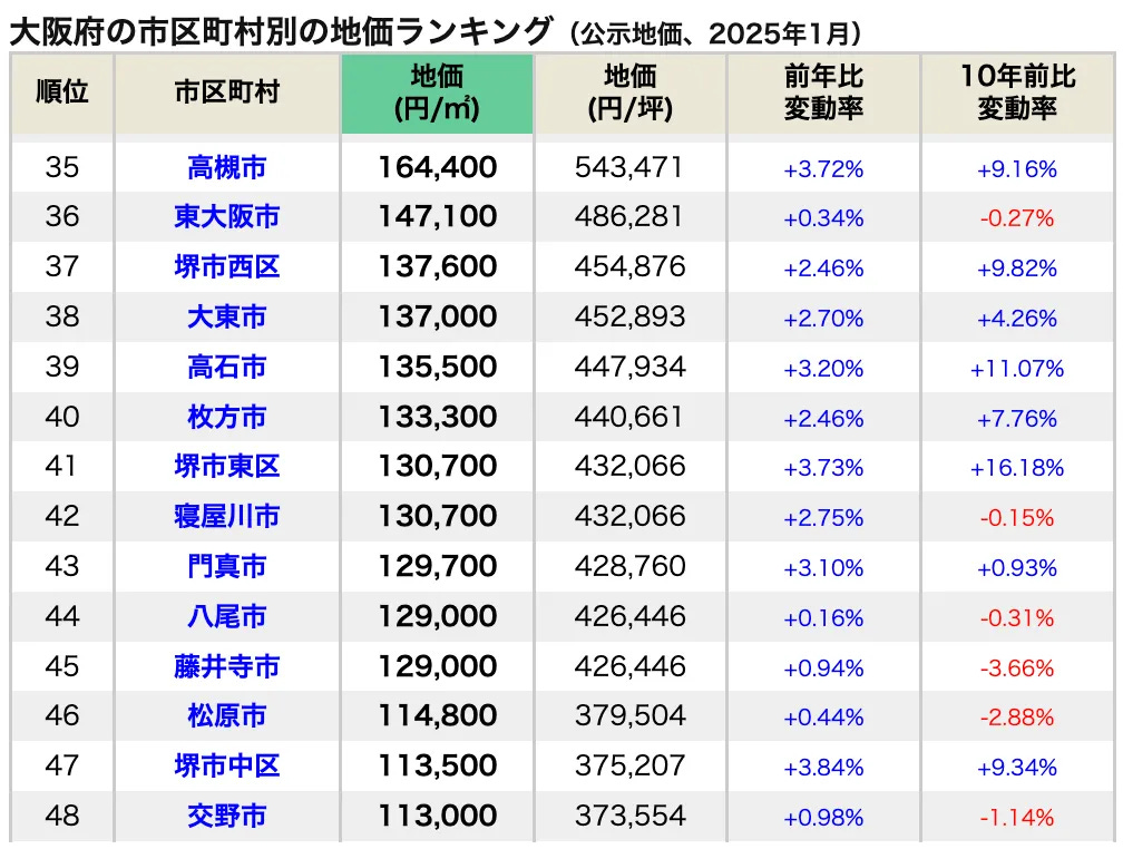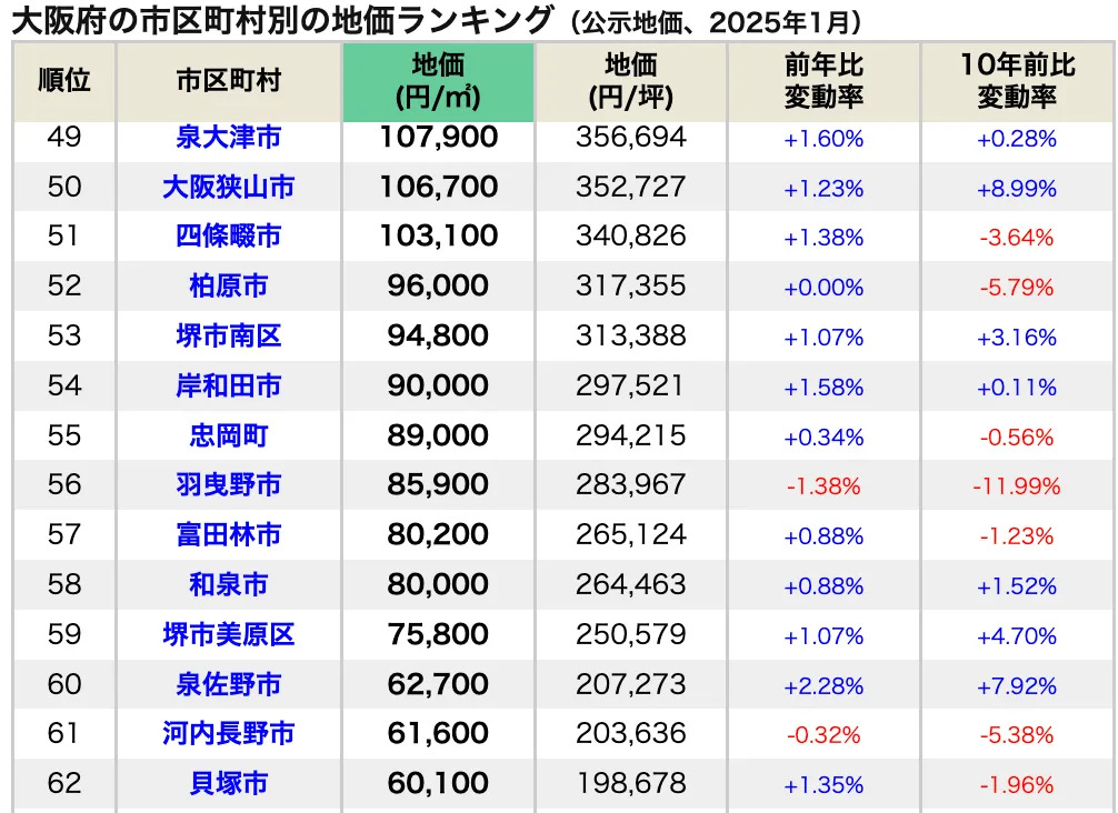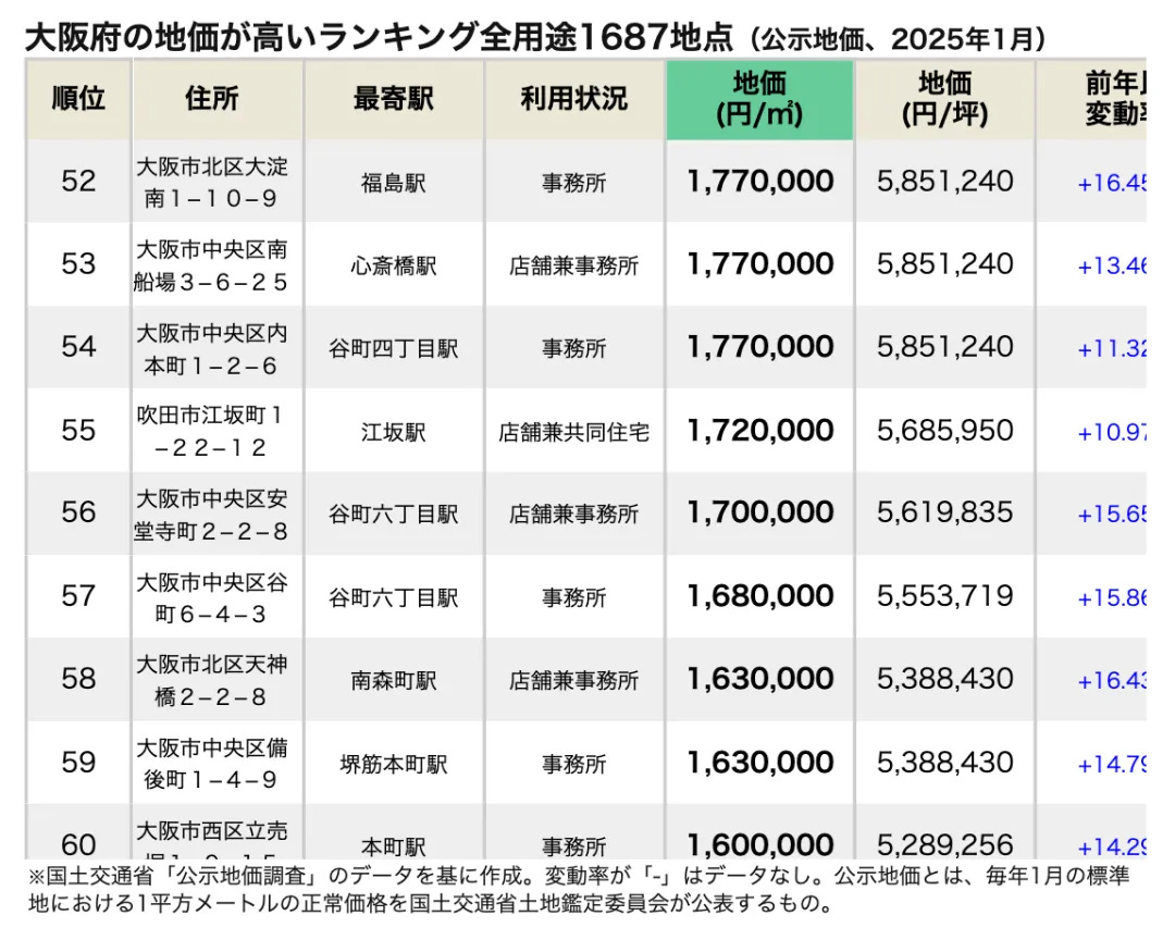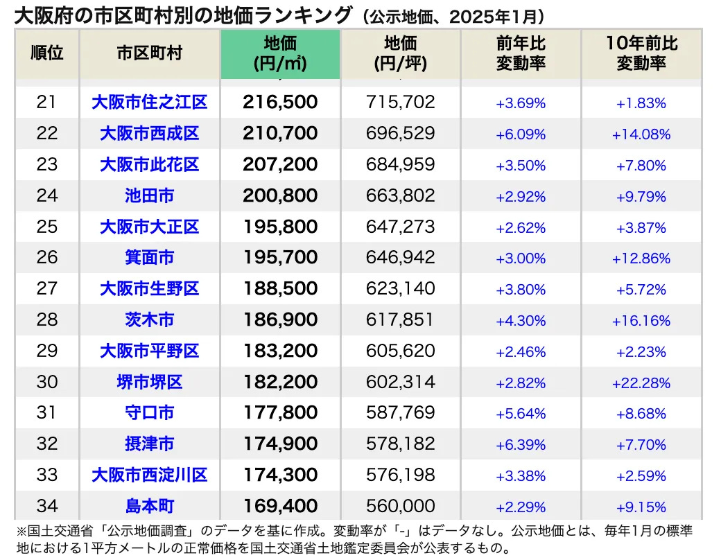 以下是大阪府市區町村地價排名(公開地價,2025年1月)的具體情況。