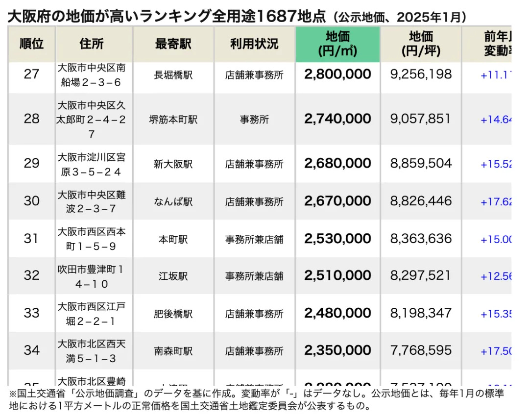 大阪府地價高價排名:JR大阪站週邊位居第一
