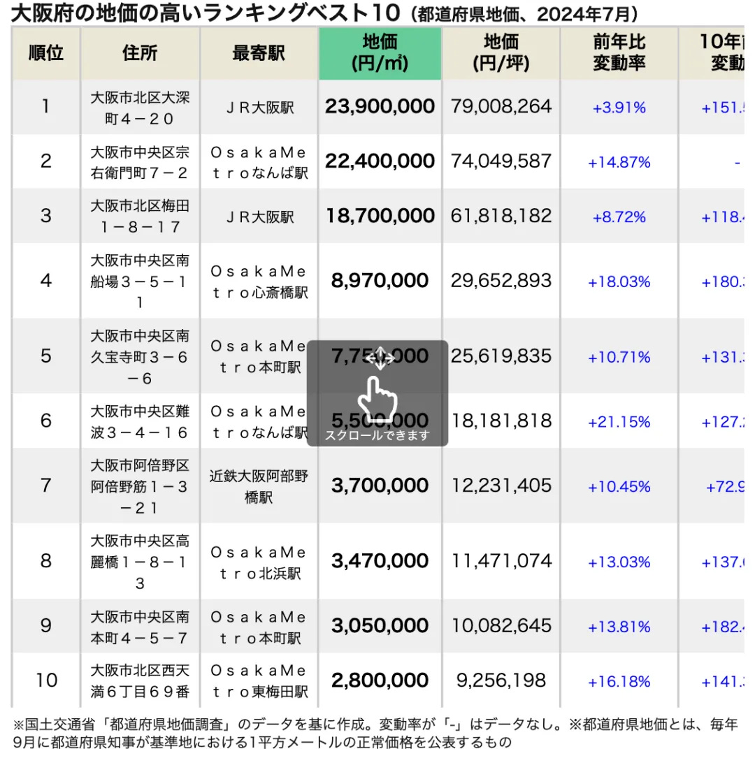 大阪府地價較高排名前十(都道府縣地價,2024年7月)