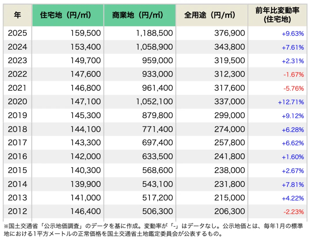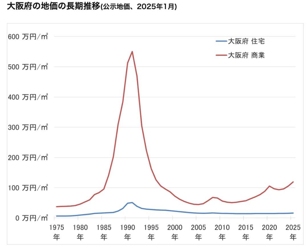 以上是根據國土交通省公佈的2025年1月公佈地價資料整理的大阪府地價長期走勢。