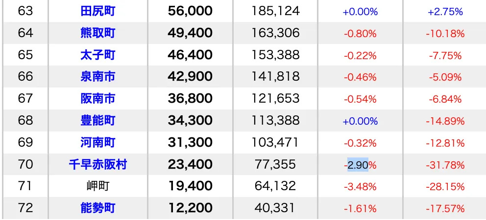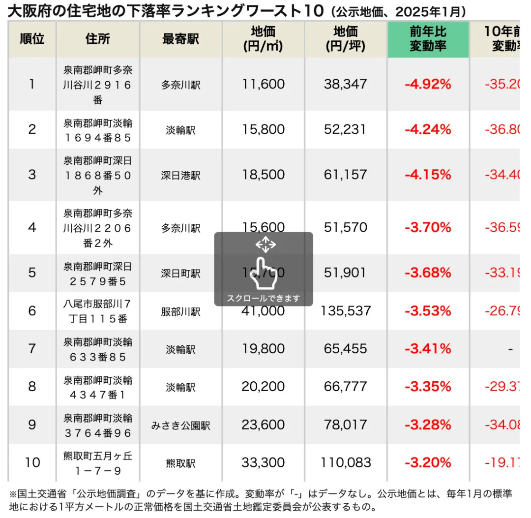 大阪府住宅地下落率排名最差10名(公開地價,2025年1月)