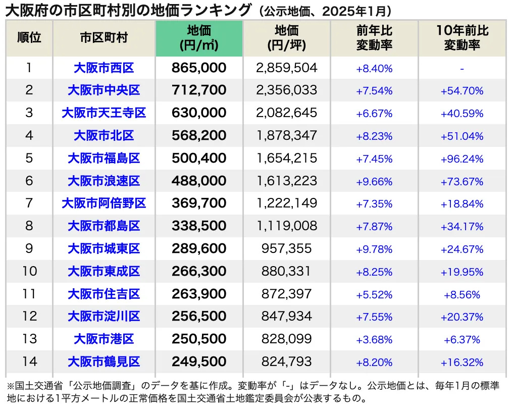 在大阪府的地價排名中,位居第一的是大阪市西區,其平均地價達到了865,000日圓/平方米,與前一年相比,變動率為+8.40%。