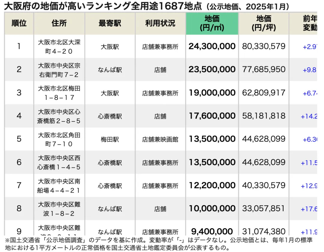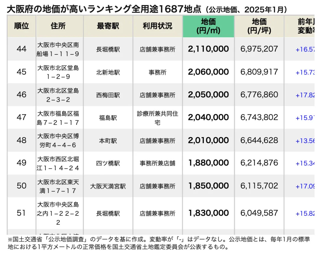 根據國土交通省2025年1月公佈的公開地價數據,大阪府全用途地價排名第一的地點是大阪市北區大深町4-20,該地點位於大阪站週邊。具體資訊如下: