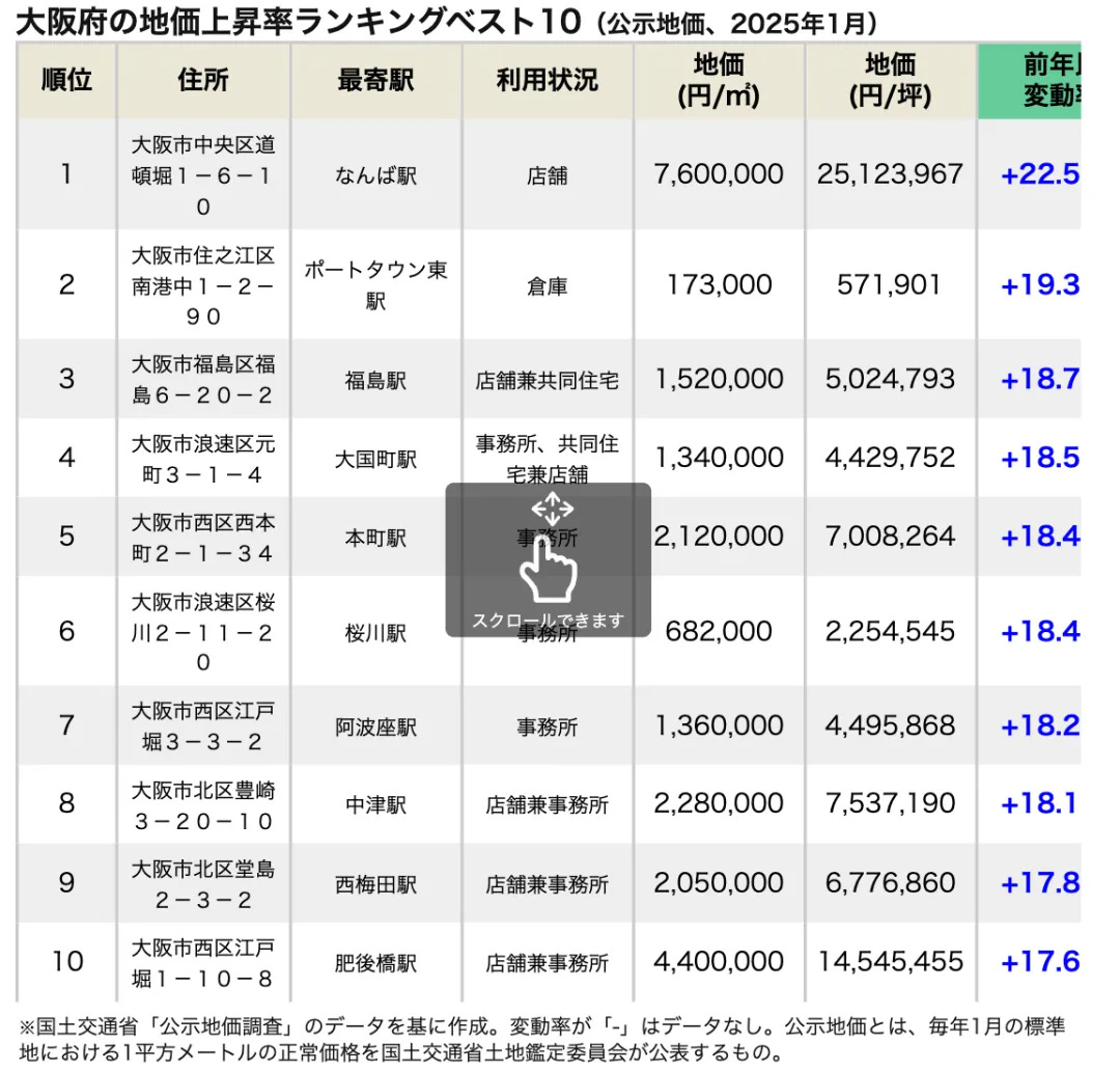 在地價上漲率方面,大阪府地價上漲率排名第一的地點是大阪市中央區道頓堀1-6-10,該地點位於難波站週邊。具體資訊如下: