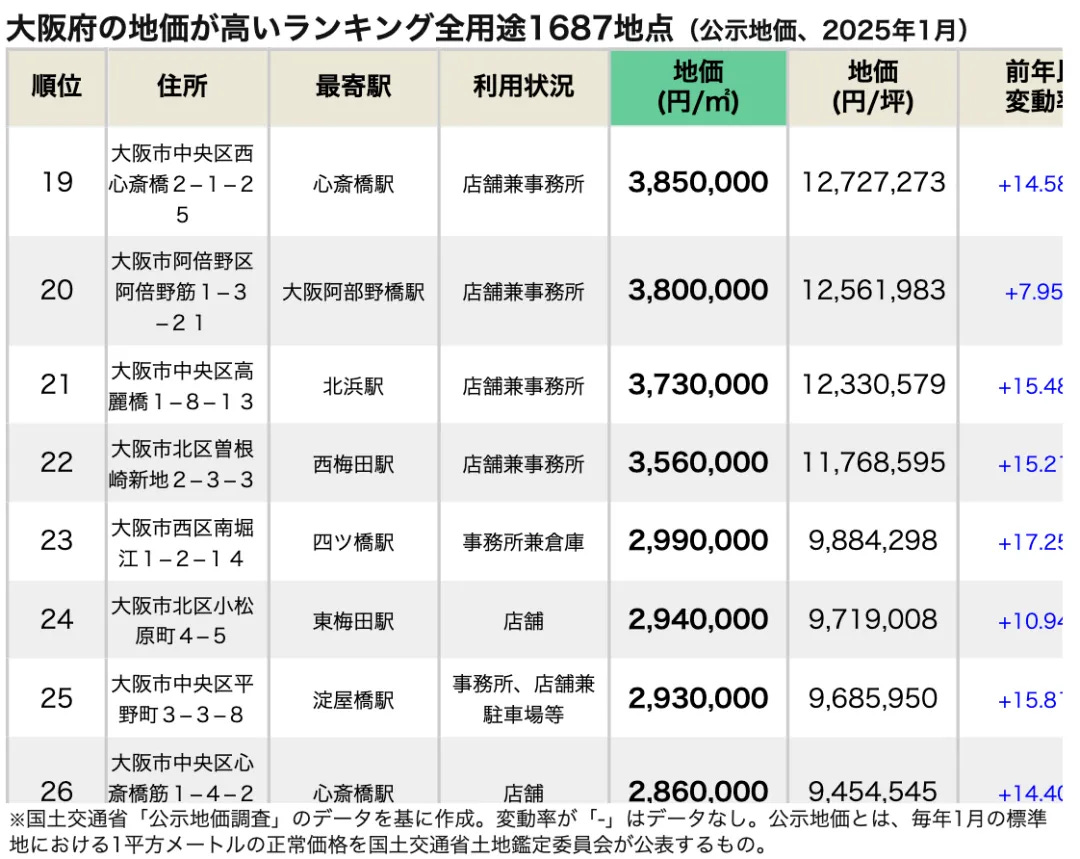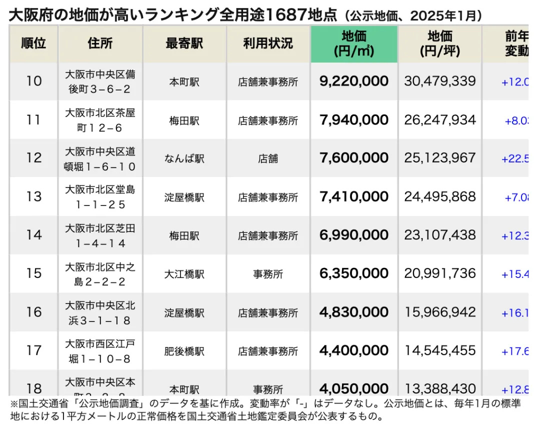 在地價較高的排名中,位居第一的是大阪市北區大深町4-20,該地點位於JR大阪站週邊,地價為每平方米23,900,000日元,與前一年相比,變動率為+3.91%。