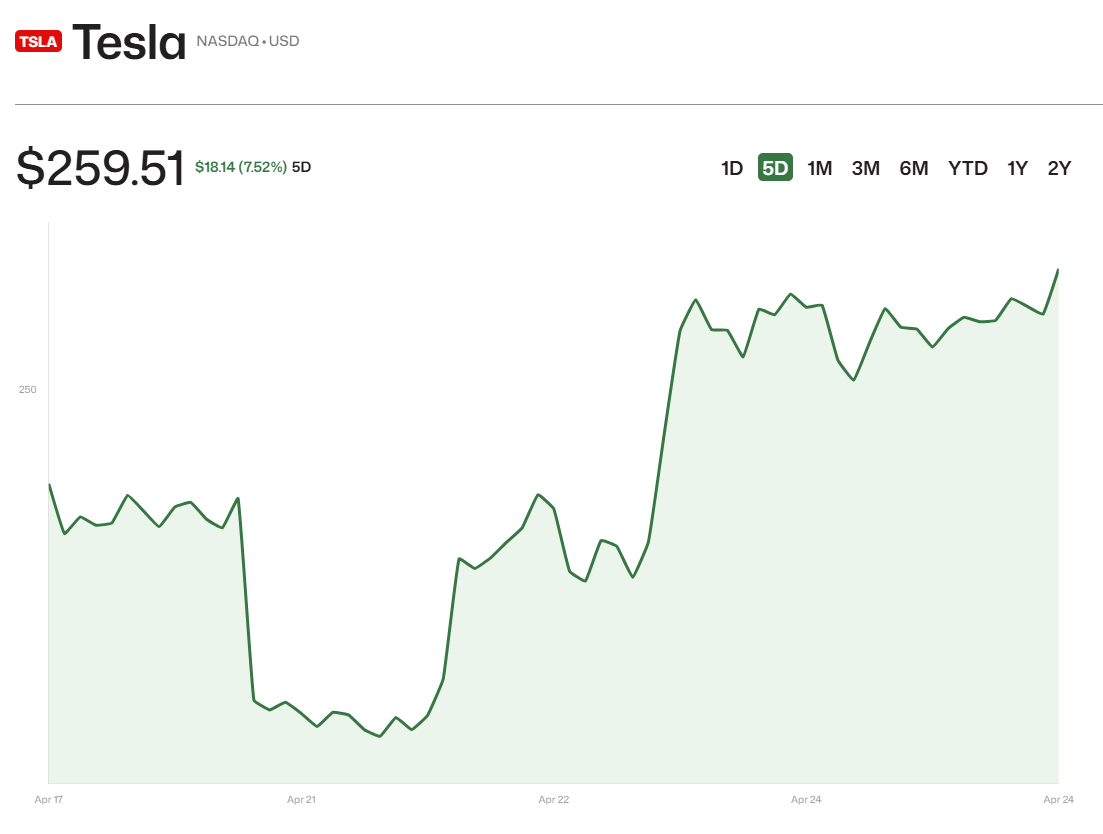 這樣的表現稱得上慘不忍睹。但讓投資人驚喜的是,22日財報發表會後特斯拉股票盤後竟上漲了5%,23日以漲5.37%收盤,24日以漲3.5%收。