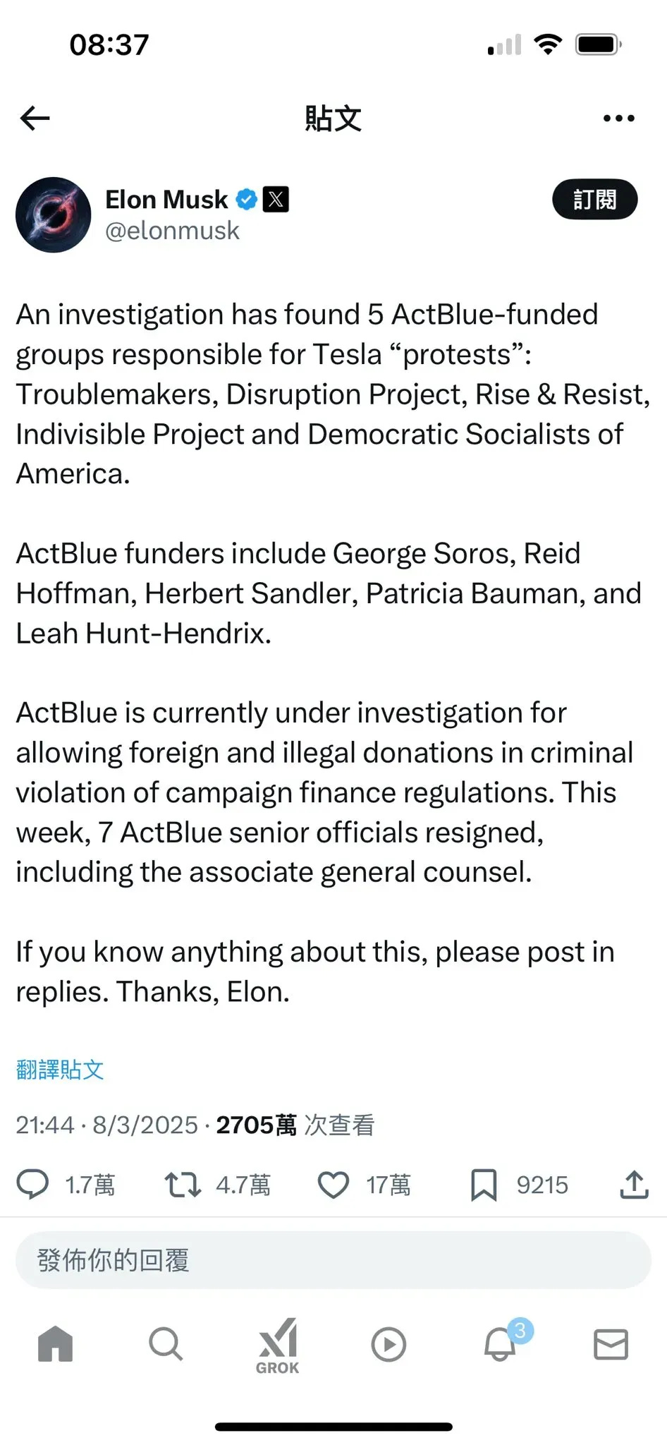 他公開揭露,5個由民主黨募款平台ActBlue資助的團體(Troublemakers、Disruption Project、Rise & Resist、Indivisible Project 和 Democratic Socialists of America)是特斯拉抗議行動的幕後黑手。