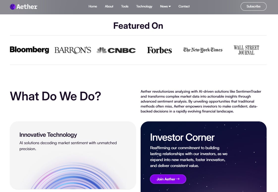 2023 年,Aether Holdings, Inc. 收購了 sentimentrader.com 的母公司 Sundial Capital Research, Inc.。 Aether Holdings 是一家多元化投資公司,專注於收購和發展各行業中擁有創新解決方案的公司。此次收購旨在將 SentimenTrader 先進的市場研究和分析平台整合到 Aether 的投資組合中,以增強其在金融市場洞察和分析方面的能力。